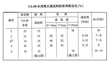 CA-50水泥耐火澆注料是不定形耐火材料中的重要品種,一般情況下常用配合比例為,CA-50水泥和耐火粉料的總用量為27%~30%,耐火骨料用量為70%-73%。CA-50水泥用量為10%~20%。當耐火澆注料用于中高溫部位時,應盡量減少水泥用量,同時增加耐火粉料用量,其品級應與耐火骨料相同或高一個等級:耐火骨料應根據窯爐使用溫度合理選擇,做到物盡其用。其顆粒級配,通常采用兩級級配,也可用統料,一般以砂率(即細骨料)占整個骨料的比值)為0.45~0.55來控制:水用量一般用質量百分比表示,也可用千克每立方米或水灰比(即水于水泥和粉料之比)來表示。其總原則是,在保證澆注料拌合物的和易性情況下,應盡量減少水用量。