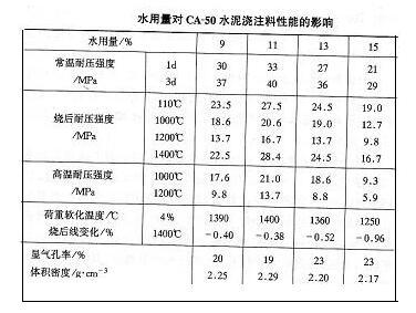 鋁酸鹽水泥品種不同,配制的耐火澆注料也不同。同一種水泥,也能配制成多品種的耐火澆注料。在耐火澆注料配合比和工藝條件相同時,其水用量對耐火澆注料性能影響規律是基本相同的。現以CA-50水泥高鋁質耐火澆注料為例,其水用量對澆注料性能的影響是至關重要的。耐火骨料和粉料均為二級礬土熟料,骨料<15mm的統料70%,粉料和水泥各位15%。成型初凝后潮濕養護1d拆模,然后進行標準養護2d,檢驗各種性能。從表中看出,澆注料隨水用量的增加,各種性能普遍有較大的下降:常溫耐壓強度降低27%~35%,烘干耐壓強度降低到19.1MPa,燒后耐壓強度由1400℃將至1250℃,燒后線變化由—0.38%降為—0.96%,顯氣孔率由19%增值23%,體積密度由2.29g/cm³降至2.17g/cm³。這就是水,配置鋁酸鹽水泥耐火澆注料時,水用量(或水灰比)的選用十分重要。當水用量多時,加熱后水分逸出,孔隙增多,結構疏松,致使各種性能全面降低。因此,在保證其施工和易性的條件下,應盡量減少拌和物的水用量。在不摻減水劑的前提下,鋁酸鹽水泥耐火澆注料的適宜水用量為10%~13%。