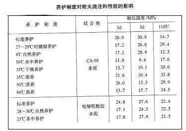 耐火澆注料的養護制度分為標準養護、自然養護、潮濕養護、蒸汽養護、水中養護、和干燥養護等。標準養護是在溫度(20±3)℃和濕度大于90%的條件下養護。鋁酸鹽水泥耐火澆注料成型初凝后,置于何種養護制度條件下養護,十分重要,(詳見下表)
