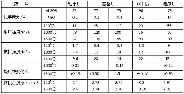 無水泥耐火澆注料的配合比,應根據試驗確定。成型后的試樣,在不小于10℃的環境中自然養護,不得淋水。養護1天后拆模,在養護2天。養護到期后,檢驗常溫耐壓強度,一般為3~8MPa。試樣烘干后進行各種性能檢驗,其結果(見下表)