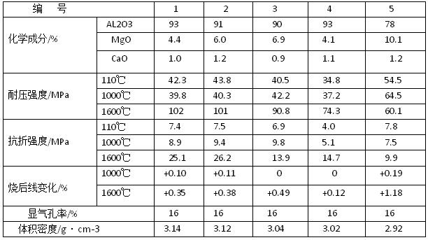 低水泥鋁鎂尖晶石質耐火澆注料的組成材料,一般選擇高純或合成耐火原材料,科學級配,基質優化,用鋁酸鹽水泥CA-70或CA-80作結合劑,并摻加α-AL2O3 和 SiO2 超微粉和外加劑。按澆注料的配合比要求,準確稱量各種材料,外加4.5%~5.8%的潔凈水,機械攪拌和振動成型,自然養護到期后進行烘干,然后做材料的理化性能檢驗,有代表的檢驗結果(見下表).編號1~編號3用電熔白剛玉作耐火骨料和粉料:編號4和編號5分別用板狀剛玉和特級礬土熟料做耐火骨料,電熔白剛玉做耐火粉料:在耐火粉料中,均摻加了電熔鎂砂粉、高純鋁鎂尖晶石粉和α-AL2O3超微粉:在編號3~編號5料中,還摻加少量的SiO2 超微粉:結合劑用鋁酸鹽水泥CA-70,其用量為3%~5%:采用聚磷酸鹽做減水劑,其用量為0.14%~0.22%。當鋁酸鹽水泥凝結過快而難以保證施工時,應摻加檸檬酸等緩凝劑:耐火骨料臨界顆粒的大小,依鋼包襯工作層厚度而定。耐火骨料與耐火粉料的質量比約為7:3快干劑的用量,以試樣驟然放進到550℃電爐中并保溫一定時間后取出,試樣無爆裂時為宜。