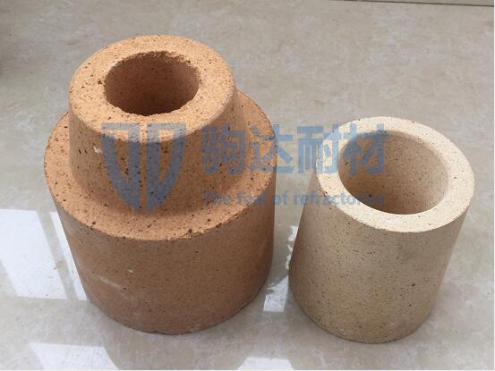 鑄口磚也叫水口磚,水口磚鑲嵌在盛鋼桶底部座磚中的耐火材料,鋼水流出口。不澆注時(shí)水口磚和塞頭磚呈線接觸,保證不漏鋼。水口磚上口是弧面形,便于開啟、關(guān)閉水口及減小鋼水流動(dòng)的阻力,下段是直線段以穩(wěn)定注流。其材質(zhì)與塞頭磚相近,可采用粘土質(zhì)、高鋁質(zhì)、鎂質(zhì)、鎂鉻質(zhì)及鋯質(zhì)的。澆注沸騰鋼及高錳鋼時(shí)黏土質(zhì)的水口易被侵蝕,故采用鎂質(zhì)或高鋁質(zhì)水口磚。鎂質(zhì)水口耐侵蝕性強(qiáng)但導(dǎo)熱性也強(qiáng),澆注中易產(chǎn)生結(jié)瘤。