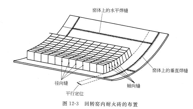 升溫以后,水泥回轉窯的窯體、火磚都會膨脹。但是,鋼板和火磚的熱膨脹系數不同,火磚各部位的溫度高低也不相同,這就產生了膨脹差。膨脹差可以產生空隙,致使磚塊松動;也可以產生應力,致使磚塊擠壞。如果磚塊之間不擠泥緊,就會發生抽簽、掉磚事故。如果磚塊擠得太緊,擠壓力超過了磚的強度,就會使窯襯破壞。所以,既要不抽簽、不掉磚,又要不把磚擠壞,就要研究膨脹縫的留設問題。回轉窯內,耐火磚的布置如圖12-3所示。