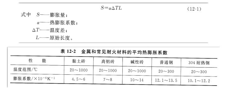 金屬材料和耐火材料的具有不同膨脹系數,耐火材料熱端和冷端具有不同的溫度。熱膨脹量的計算式見式(12-1),不同材料的熱膨脹系數見表12-2。