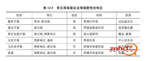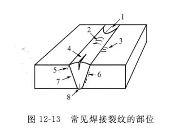 圖12-13顯示了常見焊接裂紋的部位。其中,發(fā)生在焊肉中的裂縫有1、2、4、8幾種;發(fā)生在熱影響區(qū)的裂縫有3、6兩種;7為焊縫的熔合線。 裂紋分為熱裂、冷裂兩種。一般情況下,熱裂為沿晶斷裂;冷裂為穿晶斷裂。熱裂發(fā)生在焊接過程或焊后的高溫使用過程,一般溫度髙于650°C;冷裂則出現(xiàn)在300°C:以下,不僅在焊接的冷卻過程中產(chǎn)生,也可在放置或使用中產(chǎn)生。常見焊接裂紋或焊接脆性的特征見表12-5。