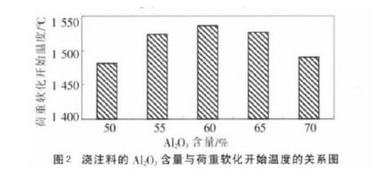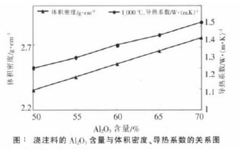 以特級、二級及三級高鋁熟料及焦寶石為主要材料,加入硅微粉,以鋁酸鈣水泥為結(jié)合劑,以磷酸鹽為減水劑。固定硅微粉、水泥及磷酸鹽減水劑的加入量,測試澆注料的不同氧化鋁含量與荷重軟化開始溫度、體積密度、導(dǎo)熱系數(shù)的關(guān)系。(見下圖1)由下圖可知,隨著低水泥澆注料氧化鋁含量的提高,澆注料的體積密度增大,導(dǎo)熱系數(shù)提高。(由圖2)可知,低水泥澆注料的氧化鋁含量在60%左右時澆注料的荷重軟化開始溫度較高,可選擇在軋鋼加熱爐高溫段使用,從性價比來考慮,氧化鋁含量在50%的澆注料可選擇在軋鋼加熱爐的低溫段使用可達到有效的節(jié)能目的。