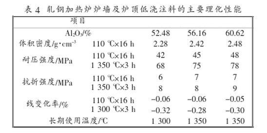 軋鋼加熱爐的預(yù)熱段工作溫度一般在1200℃以下,采用氧化鋁含量為50%~55%左右的低水泥澆注料完全可滿足使用需求。加熱段及均熱段工作溫度一般在1350℃左右,可選擇氧化鋁含量為60%左右的低水泥澆注料,該澆注料細粉應(yīng)選擇雜質(zhì)含量較低的原材料,以提高澆注料的高溫使用性能。爐墻及爐頂澆注料主要理化指標(biāo)見(下表4)