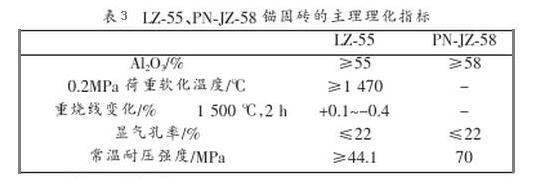 采用不定型耐火澆注料作為工作襯里的軋鋼加熱爐,錨固磚的選擇較為關(guān)鍵,因為錨固磚對整個加熱爐襯里的結(jié)構(gòu)起著重要的作用,按照高鋁磚指標(biāo)區(qū)分錨固磚可以分為LZ-75、LZ-65、LZ-55、LZ-48四種,LZ-75、LZ-65的錨固磚的導(dǎo)熱系數(shù)、熱膨脹率及成本較LZ-55的錨固磚高,在軋鋼加熱爐上一般部位,LZ-55錨固磚完全可滿足使用需要。而在水粱及壓下部位,一般選用振動成型的PN-JZ-58的錨固磚。因為振動成型的錨固磚臨界粒度較大,材料的結(jié)合強度較高,錨固磚的抗拉強度也較機壓成型的高,并且通過國內(nèi)眾多軋鋼家加熱爐的使用證明(下表3)為LZ-55、PN-JZ-58錨固磚的主要理化指標(biāo)。