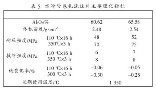 水冷管包扎用澆注料其施工厚度一般在50~60mm左右。通常情況下,水冷管包扎用澆注料每座加熱爐只選擇一種,一般選擇氧化鋁含量為60%~65%的低水泥澆注料可滿足使用要求,但必須選擇流動性能較好的澆注料。(下圖5)為水冷管包扎澆注料主要理化指標(biāo)。