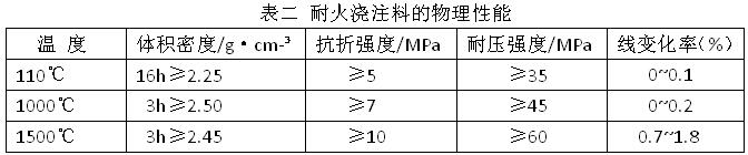 根據(jù)以上檢測結(jié)果,選用我公司(鄭州駒達耐火材料有限公司)選用了二級礬土熟料做骨料,加入部分SiC 及2%左右的Cr2O3進行試驗。研制的耐火澆注料的化學(xué)組成:AL2O3≥60%,SiO2≥25%,SiC ≥9%,Cr2O3≤2%,CaO≤1% 其物理性能見表2