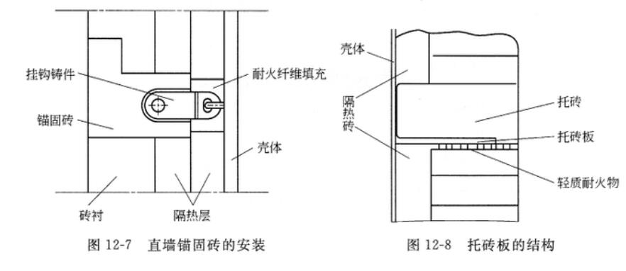 為防止預熱器直筒的襯里與殼體脫開,需要在直墻內(nèi)安裝錨固件。即在殼體上裝錨固釘,錨固釘拴住埋設(shè)在墻中的錨固磚,錨固磚拉住了直墻。在直墻上, 描固磚每隔一定間距設(shè)置一組,使直墻和殼體牢固地粘接成一體。這就防止了直墻與殼體脫開,避免了發(fā)生塌落事故。錨固磚的安裝如圖12-7所示。