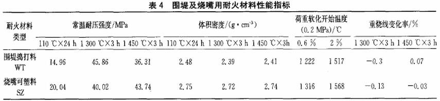 圍堤粘渣嚴重,阻礙了立柱的行程,圍堤也出現(xiàn)開裂,清渣時容易出現(xiàn)破損。其所用搗打料的性能如下表。變形量0.6%時圍堤搗打料的荷重軟化溫度為1222℃變形量2%時僅為1517℃,變形溫度的范圍比較寬,開始變形的溫度低,從1222℃變形量達到0.6%,搗打料容易發(fā)軟,粘渣就比較嚴重。燒嘴周圍搗打料形態(tài)穩(wěn)定,粘渣少,表明所用爐襯材料性較好,爐墻有內(nèi)陷、開裂情況,與搗打料的性能有關。圍堤及燒嘴所用可塑料的性能如表4.從表4看出,變形量0.6%時,燒嘴可塑料的荷重軟化溫度為1316℃,而變形量達到2%時僅為1568℃,這個溫度區(qū)間比較大,荷重軟化溫度提高,對于減少粘渣有利。
