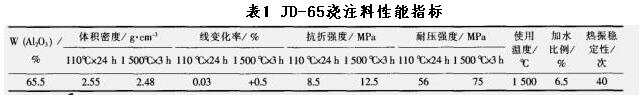 隔熱層用耐火澆注料要求體積密度小,導熱系數低,保溫性能好,考慮到隔熱層的使用溫度,在耐火材料的使用溫度允許條件下,盡可能選用體積密度低的澆注料,綜合考慮耐火材料的各種性能,選用了牌號為JDQ-1.0(鄭州駒達耐材)的輕質保溫澆注料,這種澆注料具有強度高,導熱率低、保溫性能好、燒后的永久線變化率收縮小、施工方便的優點。其具體理化性能指標見下表