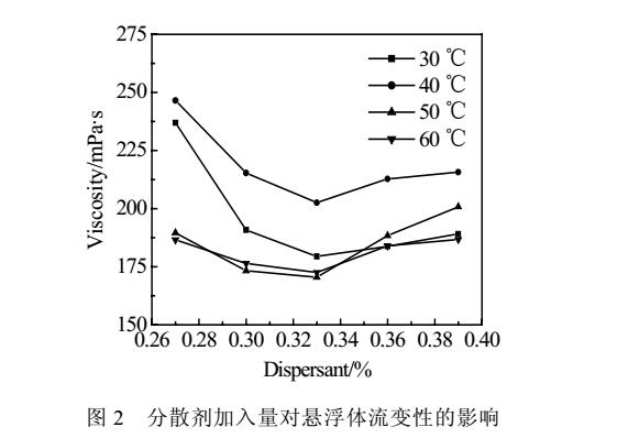 同時(shí)可以看出,在堿性條件下(料漿 pH=9),30, 40 ℃時(shí)分散劑對(duì)料漿粘度的影響較大,而 50, 60 ℃時(shí)分散劑對(duì)料漿粘度的影響較小,曲線較為平緩,表明高溫下由于聚合作用的發(fā)生,分散劑的作用明顯減小。
