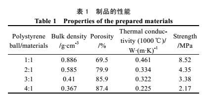 從表 1 可以看出,造孔劑聚苯乙烯球加入量對(duì)燒結(jié)后制品密度有顯著的影響。隨造孔劑加入量增加,材料的體積密度減小,氣孔率增大。當(dāng)球料比為 1:1 時(shí),體密為 0.885 g/cm3,氣孔率為 69.5%;當(dāng)球料比為 4:1 時(shí),體密為 0.367 g/cm3,氣孔率為 87.37%。