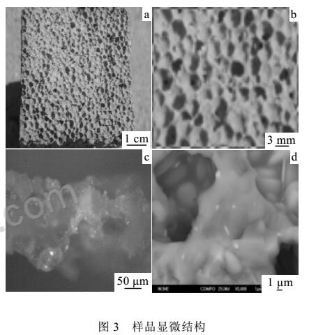 取球料比為 4:1 的樣品進(jìn)行結(jié)構(gòu)分析。燒成后材料呈淺黃色,沒(méi)有明顯缺陷和大的氣孔。孔壁薄如蟬翼,肉眼已無(wú)法判斷其厚度(圖 3a)。孔洞與孔洞之間絕大多數(shù)互不連通,只有少數(shù)孔壁有孔,使相鄰孔洞連通(圖 3b),這表明盡管孔壁很薄,但孔壁的分布十分均勻,材料組織結(jié)構(gòu)比較均勻。在光學(xué)顯微鏡下(圖 3c),制品的孔壁最薄處 200~300 µm,三孔交界處 300~400 µm。在電子顯微鏡下觀察(圖 3d),孔壁上晶粒細(xì)小,直徑在 2~4 µm,結(jié)合緊密,孔壁上還有一些封閉氣孔。可以認(rèn)為這些氣孔應(yīng)該是基質(zhì)中的結(jié)合劑燒失后留下的氣孔,在高溫下強(qiáng)化燒結(jié)并進(jìn)一步封閉形成的。