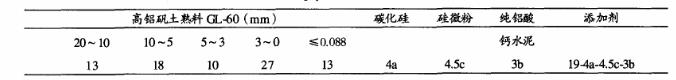 不定型耐火材料生產(chǎn)中,控制原材料的粒度分布是控制產(chǎn)品質(zhì)量的關(guān)鍵工序之一。為此,根據(jù)經(jīng)驗、原料性質(zhì)及澆注料粒度的配比理論通過反復(fù)試驗對比,最終確定AL2O3-SiC質(zhì)的鐵水包澆注料配方中,骨料:粉料(百分比=68%:32%),臨界粒度為10mm,原料粒度分為10mm、5~10mm、5~3mm、3~0mm以及≤0.088mm,具體配比如表3