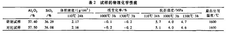 燒后線變化率系指試樣在規定溫度下加熱一定時間后的長度不可逆變化量與加熱前其長度之比,以百分率表示。若材料的線變化率過大,則對其襯體的破壞較大,易產生結構剝落,降低其使用壽命。見表2.有表2可知,研制的新型耐火澆注料與進口耐火澆注料具有相近的燒后線變化率,1300℃X3h燒后均為-0.2%。分析原因,主要是原料中骨料均為優質的焦寶石,雜質含量小,耐火度高,故燒后線變化小:再則基質中添加有AL2O3,在耐火澆注料的使用過程中,AL2O3和SiO反應生成莫來石,莫來石的反應會產生一定的體積膨脹,補償了澆注料在高溫下的部分收縮,這樣就減小了澆注料在高溫下的收縮,從而改善了耐火澆注料在高溫下的體積穩定性。