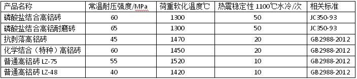 高鋁磚性能指標變化較廣,在使用時需依制品等級和使用場所確定其物理性質。一些高鋁磚的主要物理性能見下表所列