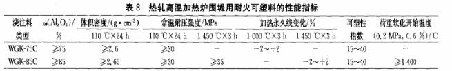 熱軋高溫加熱爐用耐火可塑料分為WGK—75C、WGK—85H 2個牌號。其中WG、K分別為 武鋼、可塑料的漢語拼音字母縮寫:后面的數字表示產品的AL2O3含量。數字后字母H表示有特定要求的材質,C表示普通材質要求。熱軋高溫加熱爐圍堤用耐火可塑料的性能指標應符合表8的規定。
