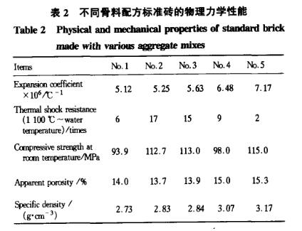 (2)結合相組成中莫來石-剛玉的質量比為75:25左右,骨料由75%~0~3mm莫來石與25%的0~1mm剛玉顆粒復合而制得的標準磚,具有很好的熱震穩定性,其康熱震次數(1100℃~水冷)達17次仍未斷裂。