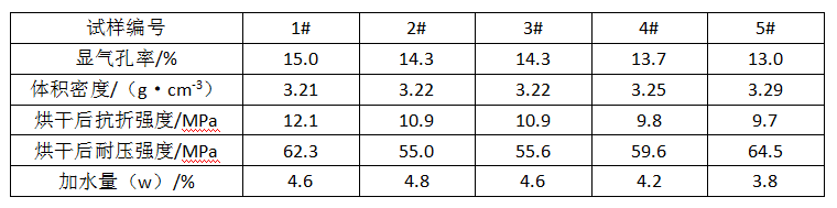 當選用α-Al2O3微粉c,加入量(w)為3%~6%時,配料用水量相同,并且試樣的物理指標也在目標值內。