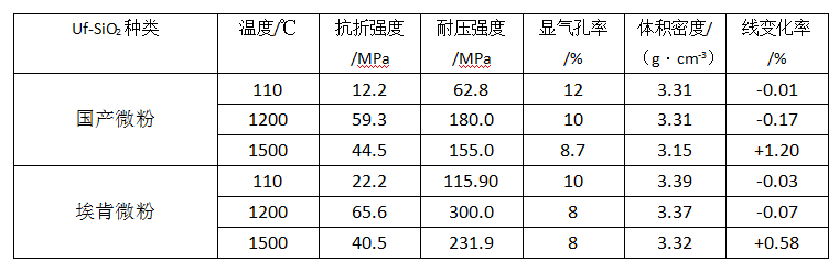 本實驗選用國產微粉和埃肯微粉作對比試驗,國產uf-SiO2配料用水量3.5%(w),埃肯uf-SiO2配料用水量3.3%(w)。澆注料的物理性能見表2。可以看出,要達到相近的流動性,用國產的uf-SiO2時,施工用水量多于用埃肯uf-SiO2的用水量,試驗的各相物理指標都不如用進口微粉的試樣。更為嚴重的是,因為國產微粉雜質含量高,1500℃燒后試樣外觀規整。為了制得質量優良的預制塊,決定采用埃肯的uf-SiO2。