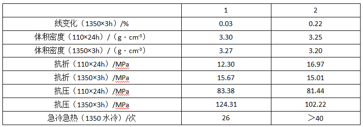 將以上2組材料的熱膨脹性線變化、體積密度、 抗折、抗壓和急冷急熱性能進行測定得以下數據,見表2。