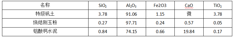 以特級(jí)礬土熟料和燒結(jié)剛玉為骨料和摻合料,鋁酸鈣水泥為結(jié)合劑,外加少量減水劑和一定比例的耐熱鋼纖維。主要原料的理化性能見表1。