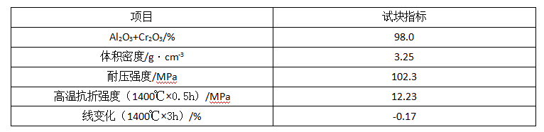 由于這種鉻剛玉磚長期使用在1 400℃左右的高溫下,不但經受高溫下的劇烈磨損,而且還有熔融氧化鐵的化學侵蝕,在這種使用條件下,想要使磚的使用壽命有明顯的提高,那么這種磚在高溫下必須有足夠的強度,才能夠經受住強烈機械磨損,所以重點檢測了研制試塊的高溫抗折強度指標。