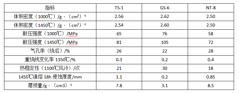 對(duì)于所使用的三種外加劑,由于GS~6的入使物料具有較好的分散性和流動(dòng)性,同時(shí)可使制品中產(chǎn)生的莫來(lái)石基質(zhì)量增加,有利于制品高溫性能的增強(qiáng)。而TS-1的加入,因在燒結(jié)開(kāi)始時(shí)表面出現(xiàn)液相,使得氣孔封閉,阻止了內(nèi)部的進(jìn)一步燒結(jié),對(duì)制品的高溫性能產(chǎn)生不利影響。NT-8的加入,可使加入物與顆粒連接緊密,但高溫下膨脹使得材料強(qiáng)度下降。