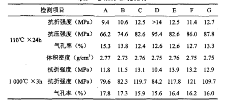 按照配方進行嚴格稱量,在攪拌機內干混均勻后,加入適量清潔水攪拌充分,振動成型制成40mm×40mm×160mm條樣,自然養護24h后脫模,經110℃×24h烘干后,分別在1000℃進行熱處理,觀察各個配方的性能指標情況。