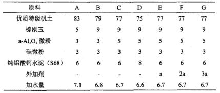 為了考證不同組分對耐火澆注料理化指標的影響,進行了大量的實驗,這里只列舉了以下具有一定代表性的幾組配方進行說明,每組配方中骨料基質配比為70:3。