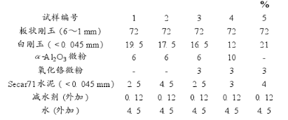 表3為5組添加粒度<0.045mm的尖晶石和氧化鉻微粉的低水泥澆注料的試驗配方。表4為1600℃ 3h燒后試樣的性能指標。