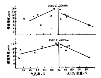 圖1 1500℃、1600℃時保溫30min的氣孔率,Al2O3含量與侵蝕深度的關系