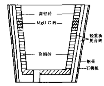 使用試驗在大冶鋼廠四煉鋼60t精煉包上進行。鋼包外殼為Φ2700~Φ2970mm的圓錐體。工作襯渣線部位用MgO-C磚,鋼液部位用高鋁磚,有時也使用全MgO-C工作襯。復合保溫耐火磚襯砌于工作襯與鋼殼之間,代替原用的粘土質永久襯,其軔筑情況見圖7。