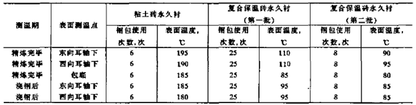 過去,大冶鋼廠為了提高鋼包的隔熱性能,減少鋼水溫降,曾使用過隔熱磚,砌于粘土質永久襯和鋼殼之間。這雖然在減少鋼水溫降上起了較好的作用,但由于隔熱磚與粘土質永久襯磚結合的不好,在換砌工作襯時,粘土質永久襯常常因剝離而脫落。采用輕重質復合保溫耐火磚后,保溫層與永久襯只砌一個磚型,與原砌筑普通粘土磚永久襯時需用T3、T38兩個磚型相比,砌筑方便簡單,而且復合保溫磚帶有斜面,砌筑時相互楔緊,砌筑質量也有所提高。為了考核采用復合保溫耐火磚后的保溫效果,在試用過程中,主要使用表面溫度計對鋼包外殼進行溫度測量,并與未用復合保溫磚的鋼包外殼進行溫度比較,其結果如表3所示。
