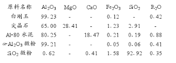實驗所用主要原料化學組成見表1。抗渣實驗用渣的化學成分見表2。澆注料實驗技術路線:原料→配合→昆合→成型→干燥→險測。