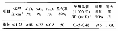 通過實驗,骨料的品種和質量對于輕質澆注料的一系列性能(體積密度、強度、隔熱性、最高使用溫度等)影響顯著。根據設計性能要求,對比選擇某專業生產廠的多孔莫來石作為骨料。該骨料由精選天然原料在1680℃高溫下人工合成,骨料莫來石化反應良好,主晶相達到70%以上,成分均勻穩定。莫來石晶體呈針狀相互交錯形成網狀結構,對于輕質澆注料的強度和高溫指標非常有利,指標見表1。