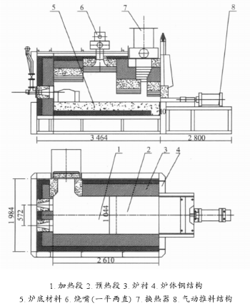 推桿式鍛造加熱爐(見圖1),通過爐端的氣動推桿將工件斷續(xù)地推入爐膛內(nèi),爐膛分為加熱段和預(yù)熱段,爐氣溫度分別為1350℃和1000℃,工件通過互推依次由預(yù)熱段進(jìn)入加熱段,當(dāng)工件加熱到鍛打溫度(1300℃)時(shí),即可出爐鍛打,此爐型與圓柱式鍛造加熱爐相比較,具有熱效率高、金屬燒損小、生產(chǎn)連續(xù)等優(yōu)點(diǎn),但是因爐子是間歇式作業(yè),且爐溫高,工件是互推進(jìn)入爐內(nèi),工件與爐底的摩擦力大,爐內(nèi)溫度不均勻,因此,要求爐底材料在相當(dāng)寬的溫度區(qū)域內(nèi)具有很高的抗折強(qiáng)度、耐壓強(qiáng)度、抗渣浸能力、熱震穩(wěn)定性和高溫耐磨性能。
