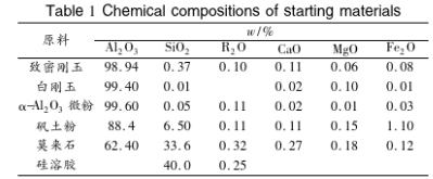 煉鋼廠所用澆注料大多數為水泥及低水泥結合高鋁澆注料。這些澆注料成型固化后一般還需養護2~3d,拆模后一般還需烘爐7d。為了追求高爐的高效化與長壽化,需要對爐體進行熱態修補,這是水泥、樹脂和焦油結合材料都無法滿足的,因為水泥結合材料需要足夠的水分和養護時間才能有良好的使用性能,而樹脂和焦油結合材料在熱態施工過程中產生有害氣體。為此,以硅溶膠為結合劑研制了高爐熱態修補用剛玉—莫來石快干澆注料。