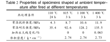 由于來自硅溶膠中的SiO2的反應活性極高,并且與活性α-Al2O3等顆粒充分接觸,降低了它與基質中α-Al2O3等顆粒發生反應的溫度,使材料在較低的溫度下就發生燒結,從而使材料在中溫處理后的強度比烘干后的大,而不像水泥結合澆注料那樣中溫處理后因水泥水化物的分解其強度反而下降。1400℃熱處理后試樣的性能指標與1100℃熱處理后的差別不大,表明試樣在1100℃已形成較好的燒結。