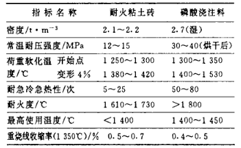 表1 普通耐火粘土磚與磷酸澆注料的主要性能
