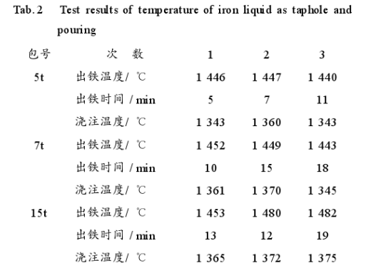 澆注料已應用于鍛壓加熱爐上。鐵液包包襯澆注料整體澆注在公司還是空白。為此需要研制一種能滿足灰鑄鐵和球墨鑄鐵鐵液包包襯的耐火澆注料。首先取渣樣進行分析判斷其酸堿性,分析結果見表1,并對鐵液溫度進行了檢測,測定結果見表2。
