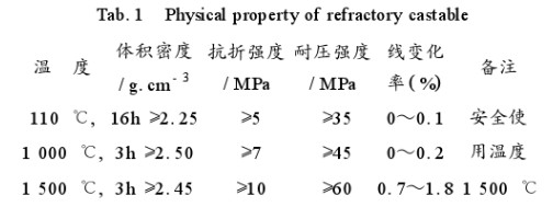 根據以上檢測結果,選用鄭州駒達新材料廠產的二級礬土熟料做骨料,加入部分SiC及2%左右的Cr2O3進行試驗。研制的耐火澆注料的化學組成(w):Al2O3≥58%,SiO2≥25%,SiC≥9%,Cr2O3≤2%,CaO≤1%,其物理性能見表3。