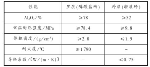我們選用鄭州駒達新材料科技有限公司生產的隔熱耐火復合磚作為試驗襯料。磚的外層屬于輕質磚。和筒體緊密接觸,具有隔熱保溫性能;里層為磷酸鹽磚,和物料接觸、具有耐磨性能。其各項理化指標如表1。