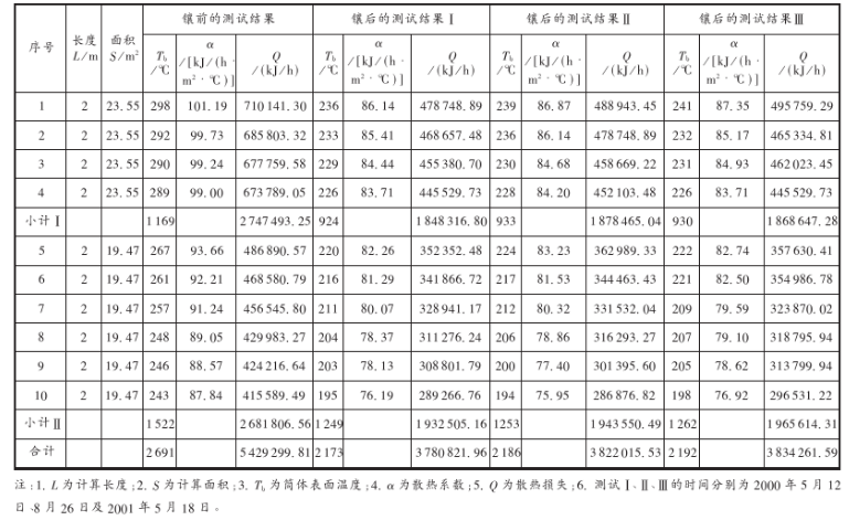 加砌隔熱耐火復合磚后1~4段的筒體表面溫度平均下降60℃,5~10段的平均溫度下降44℃,1~10段的平均溫度下降52℃;1~4筒體表面散熱損失平均減少32.11%,5~10段平均減少27.39%,1~10段平均減少29.75%。檢測和計算的結果如表2所示。