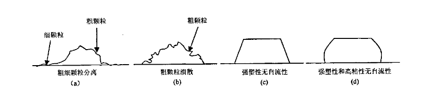 當(dāng)顆粒組成處于1區(qū)時(shí),會出現(xiàn)粗細(xì)顆粒偏析現(xiàn)象,見圖3(a)。當(dāng)處于2區(qū)時(shí),會出現(xiàn)粗顆粒潰散現(xiàn)象見圖3(b)。當(dāng)處于3區(qū)和4區(qū)時(shí)會出現(xiàn)強(qiáng)塑性狀態(tài)見圖3(c)、(d)。只有處于5區(qū)時(shí)才具有自流性能。