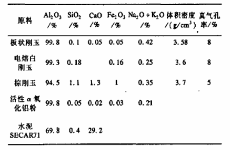 試驗(yàn)所用的原料主要有板狀剛玉、電熔白剛玉、棕剛玉、活性α氧化鋁,純鋁酸鈣水泥SE-CAR71,外加劑等。主要原料的化學(xué)成分見表1。