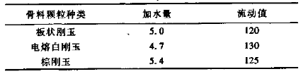 當(dāng)采用不同的顆粒骨料,固定基質(zhì)細(xì)粉的配比,所配制的剛玉質(zhì)自流澆注料其流動性及加水量見表2。